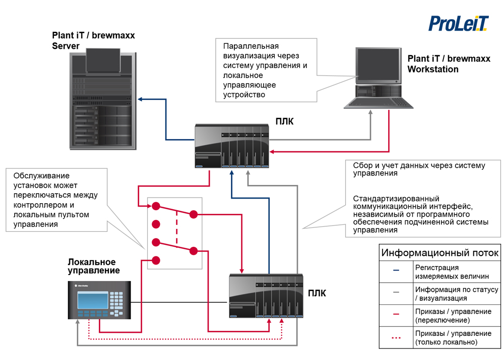 Для учета данных подчиненных и автономно работающих систем управления мы используем наш модульный интерфейс. Этот интерфейс, внедренный в Plant iT или brewmaxx, позволяет производить накопление данных напрямую через систему управления производственным процессом. При этом визуализация осуществляется параллельно через нашу систему управления (MES) и локальное обслуживающее устройство. Полезным эффектом при этом является то, управление можно в любое время переключать между MES и локальным устройством.